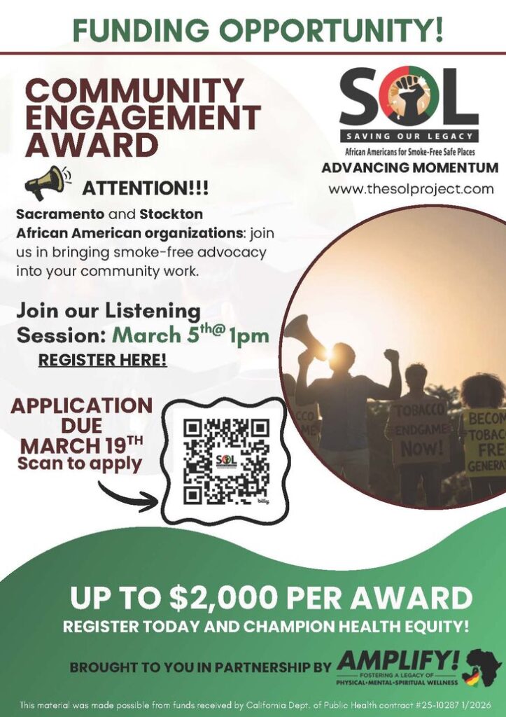 Saving Our Legacy, African Americans for Smoke Free Safe Places – SOL Advancing Momentum Project invites African American community organizations to a virtual listening session on March 5th at 1 pm for the Community Engagement Awards 2026.