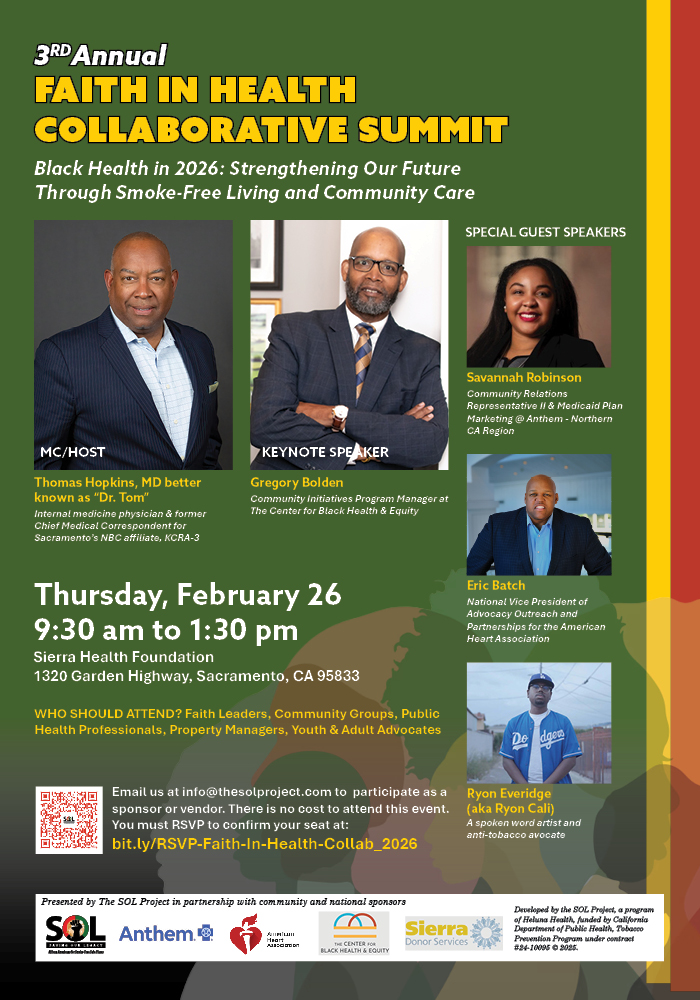 The SOL Project proudly presents the 3rd Annual Faith In Health Collaborative Summit, focusing on “Black Health in 2026: Strengthening Our Future Through Smoke-Free Living and Community Care.” Join us on Thursday, February 26, 2026, from 9:30 a.m. to 1:30 p.m. at the Sierra Health Foundation, 1320 Garden Highway, Sacramento.